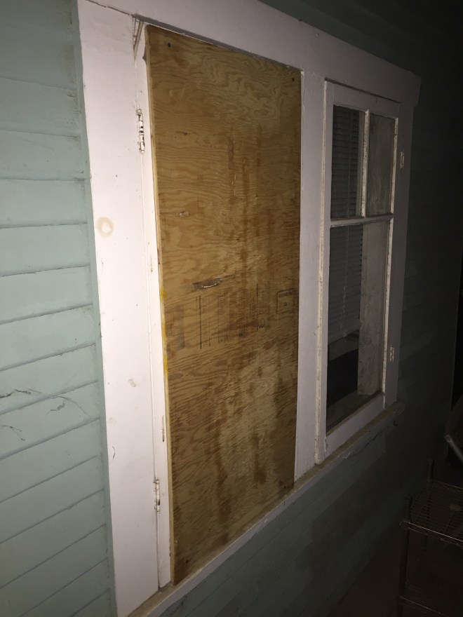 While we were at the vet, my friends Karen and Robin, having been informed of events, came over with a perfectly sized piece of plywood and secured the house in a much better fashion than even Gorilla tape and Amazon box cardboard could manage.