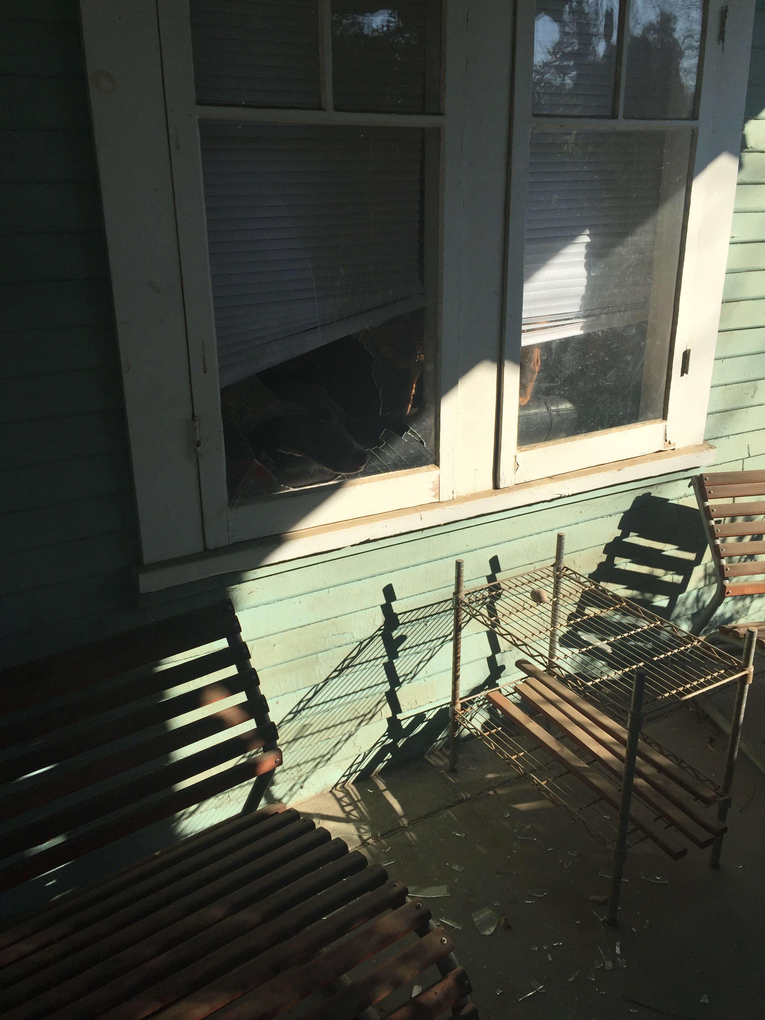 It became immediately apparent WHY her barking was so much louder and I had a pretty good idea from past experience what had happened. If any of the CSI series are to be believed, all the glass on the outside indicated the force breaking the glass must have come from the inside.